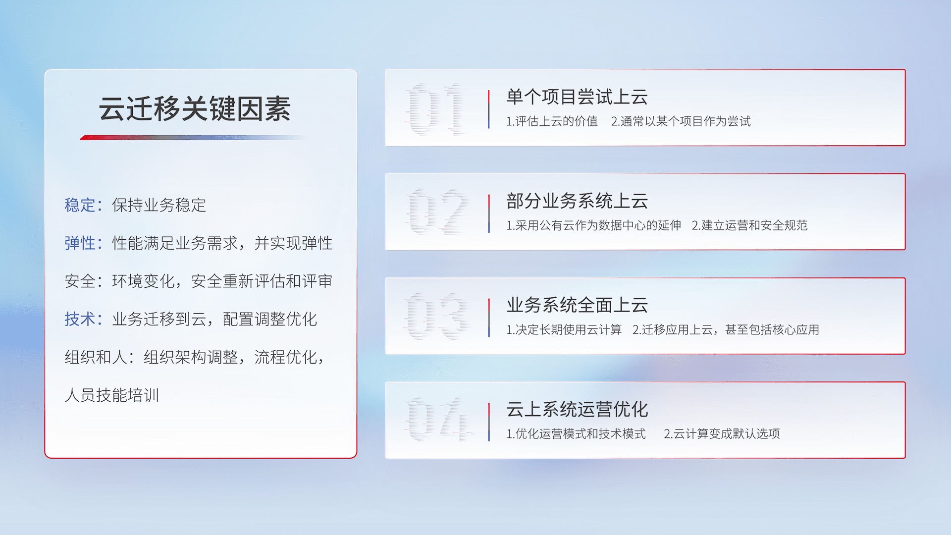 结合实际业务,,,,从规划设计、、、、云平台选型、、、云原生改造、、、、数据迁移、、集成交付,,,迁移全过程为客户识别最佳上云路径,,做好风险识别管理,,,,设计网络架构、、身份权限、、、安全审计合规、、操作审计、、、日志审计、、、监控告警策略、、多站点容灾设计等,,对云上基础设施进行整体规划,,提升IT治理水平,,以满足弹性、、、、高可用、、高性能的需求。。。